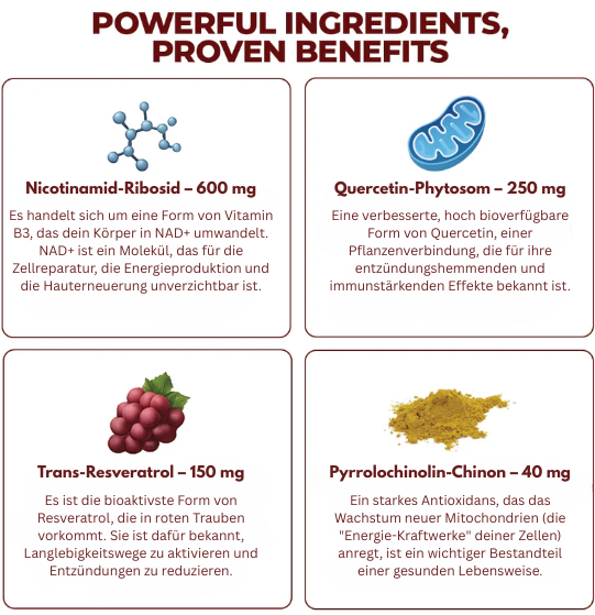 Unsere NAD⁺-Formel kombiniert ausgewählte Inhaltsstoffe in sinnvoller Dosierung – entwickelt für Energie, Zellfunktion und tägliche Balance.